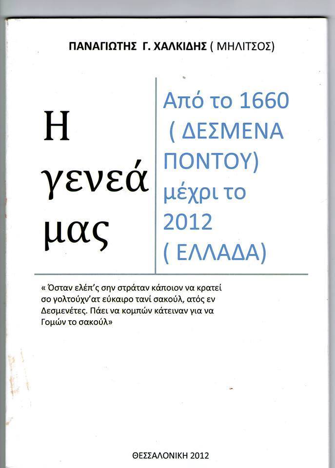 Μέσα από το βιβλίο «Η ΓΕΝΕΑ ΜΑΣ», ο συγγραφέας βρίσκει τις ρίζες του στην περιοχή της Χαλδίας του Πόντου. Η αναφορά ξεκινάει από το 1660, χρόνος που πιθανολογείται ότι έφτασαν και κατοίκησαν στο χωριό Δέσμενα (Soguteli) Χαλδίας οι πρόγονοι του, προερχόμενοι από την περιοχή της Τραπεζούντας, εξ αιτίας των βίαιων εξισλαμισμών που γινότανε σε κείνες τις περιοχές . Από το 1725 και μετά βρέθηκαν αρκετά στοιχεία για τον πρόγονο, τον γενάρχη και τους απογόνους τους μέχρι το 2012, τα οποία καταγράφηκαν με τον καλύτερο δυνατό τρόπο. Πλεονέκτημα του βιβλίου είναι η πληθώρα φωτογραφιών από τους τόπους αναφοράς , σχεδιαγράμματα των χωριών που κατοίκησαν, οι πορείες από τις εκτοπίσεις μέχρι την είσοδο τους στην Ελλάδα και την μόνιμη εγκατάσταση τους.